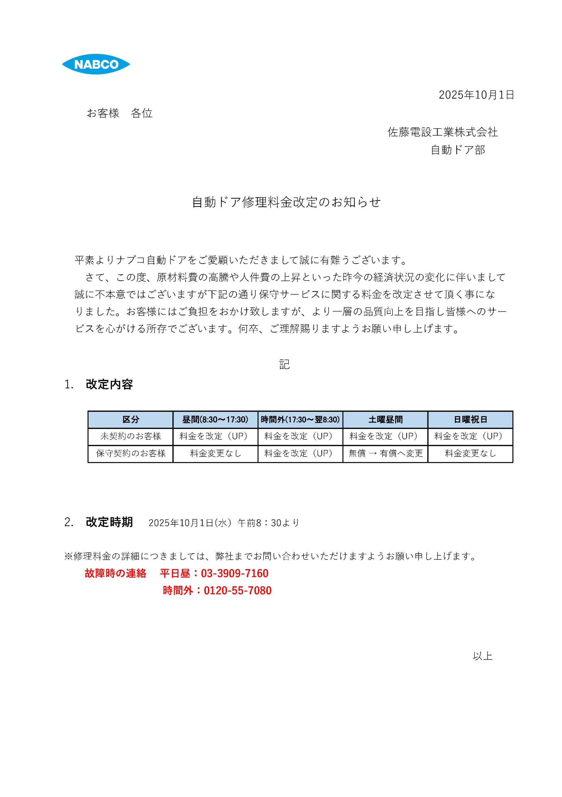自動ドア修理料金改定のお知らせ